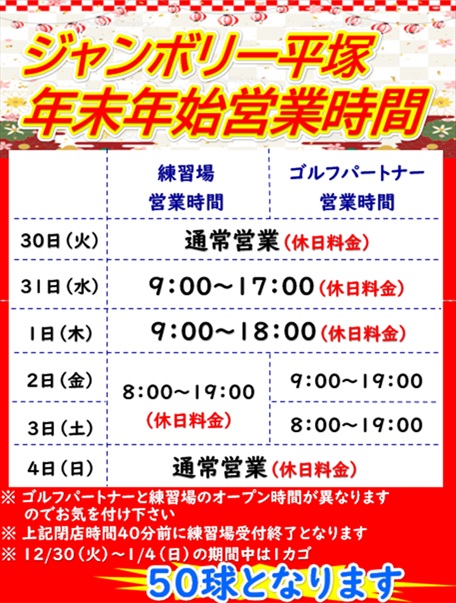 ジャンボリー平塚の年末年始の営業時間についてです。